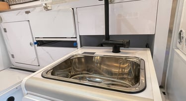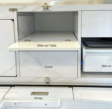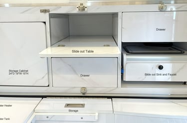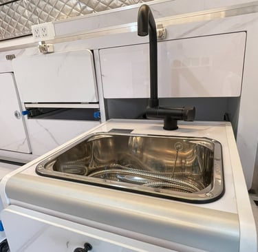 • Sink: Equipped with a sink that has a folding faucet, along with a cutting board/sink cover